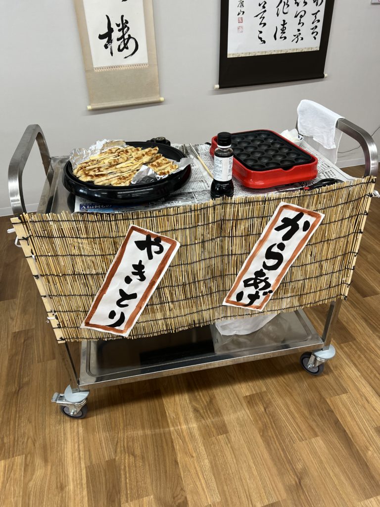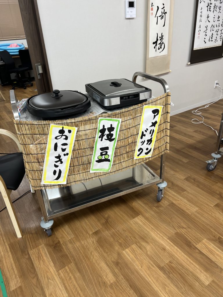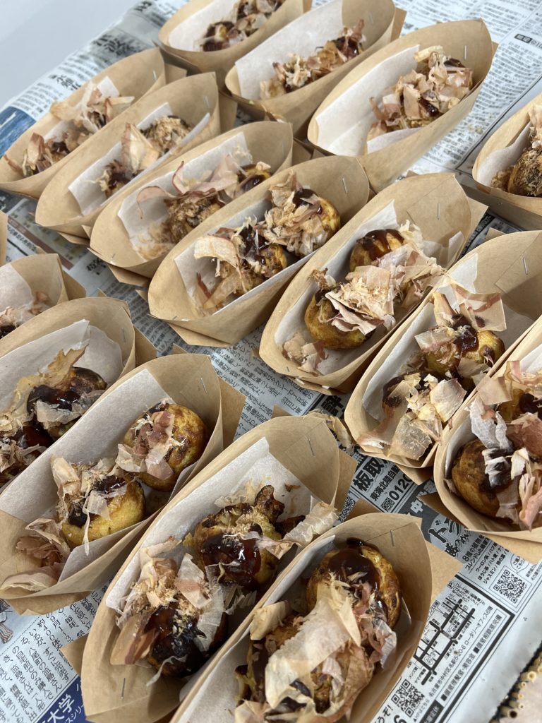 ごはんは、焼きそばやたこ焼き、焼き鳥、おにぎりなどたくさん揃えております。